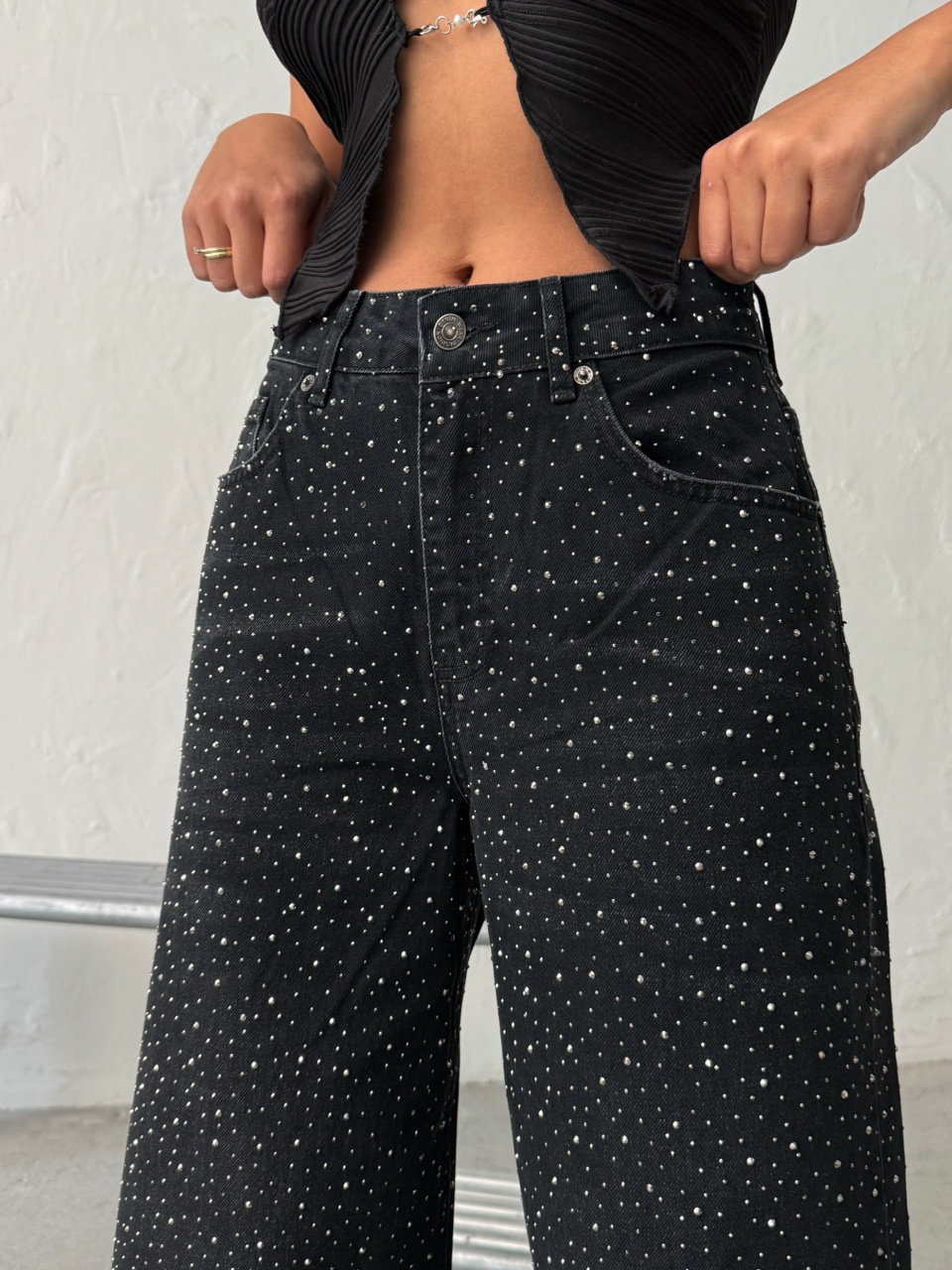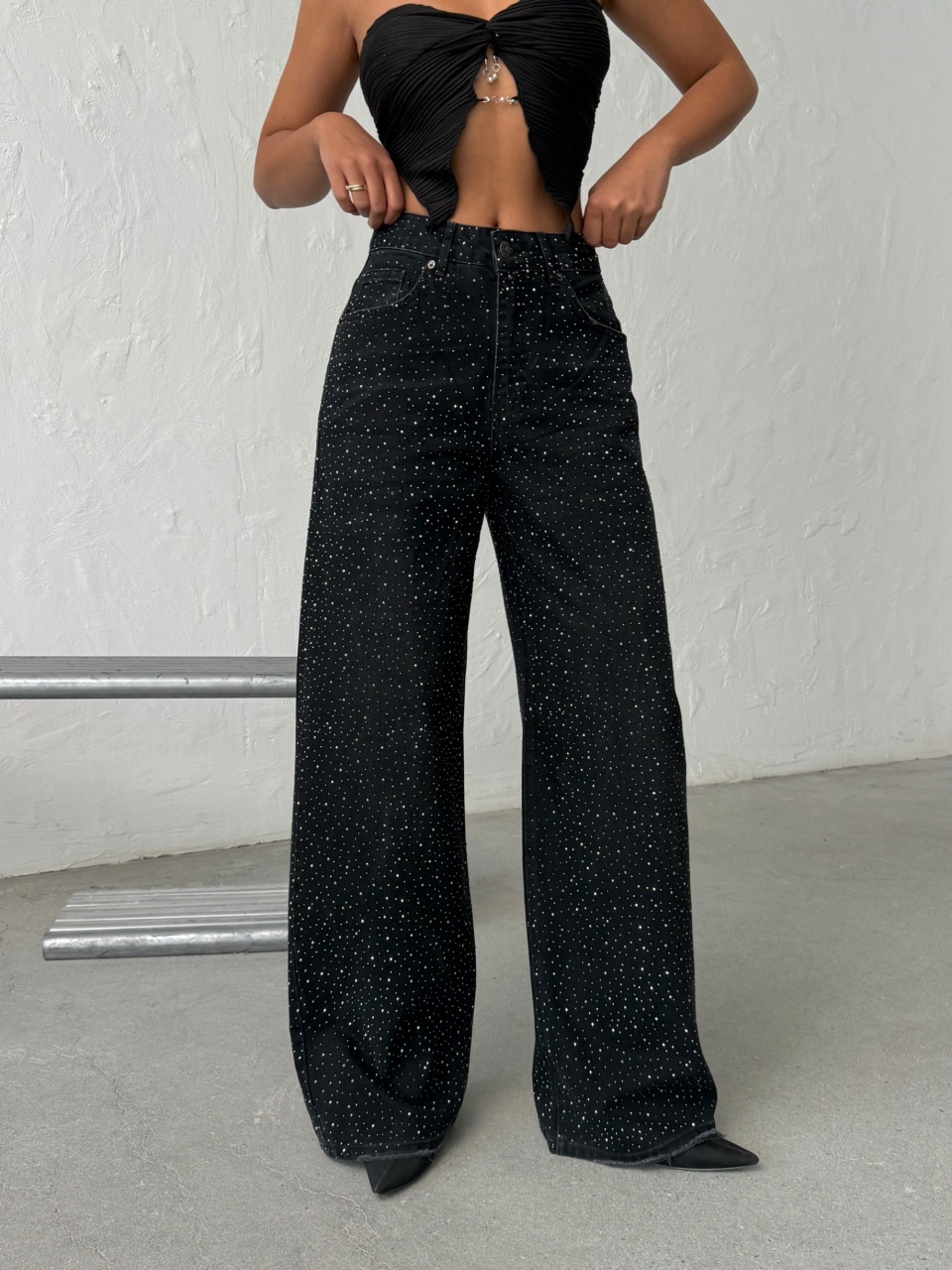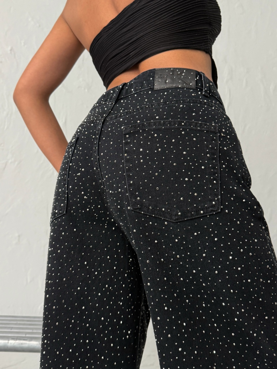 Blugi cu croi larg si aplicatii din strasuri