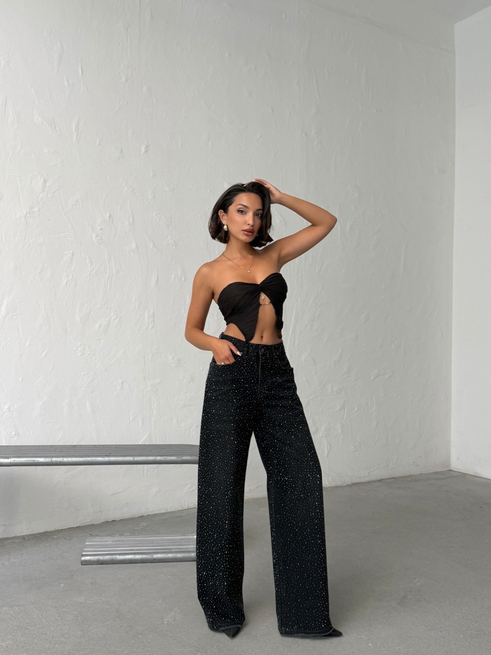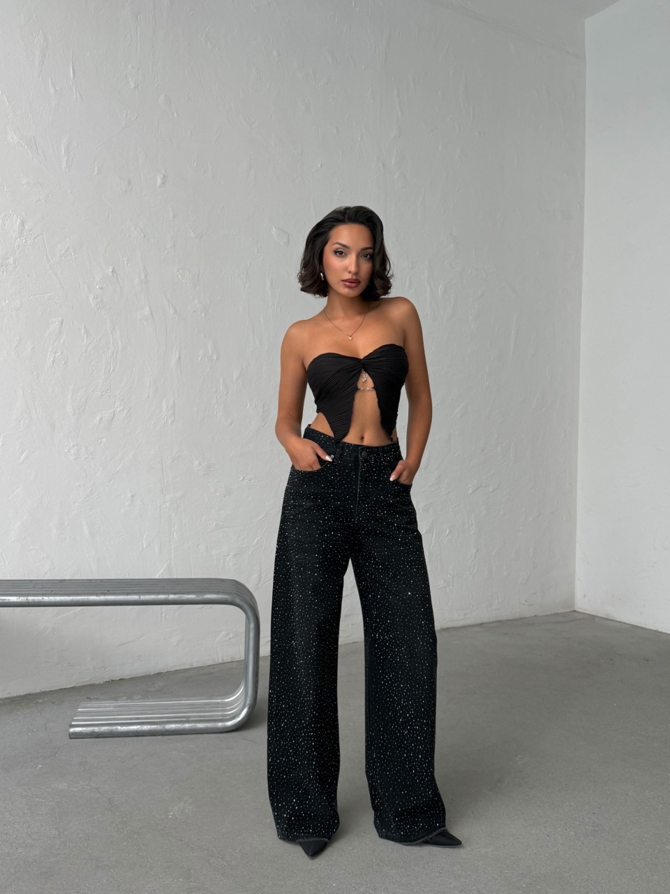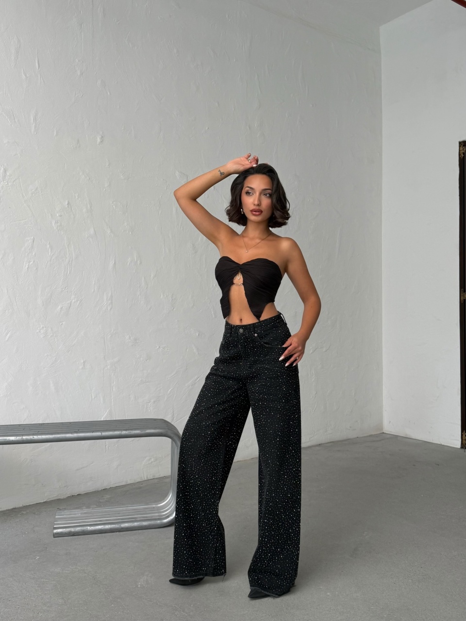 Blugi cu croi larg si aplicatii din strasuri