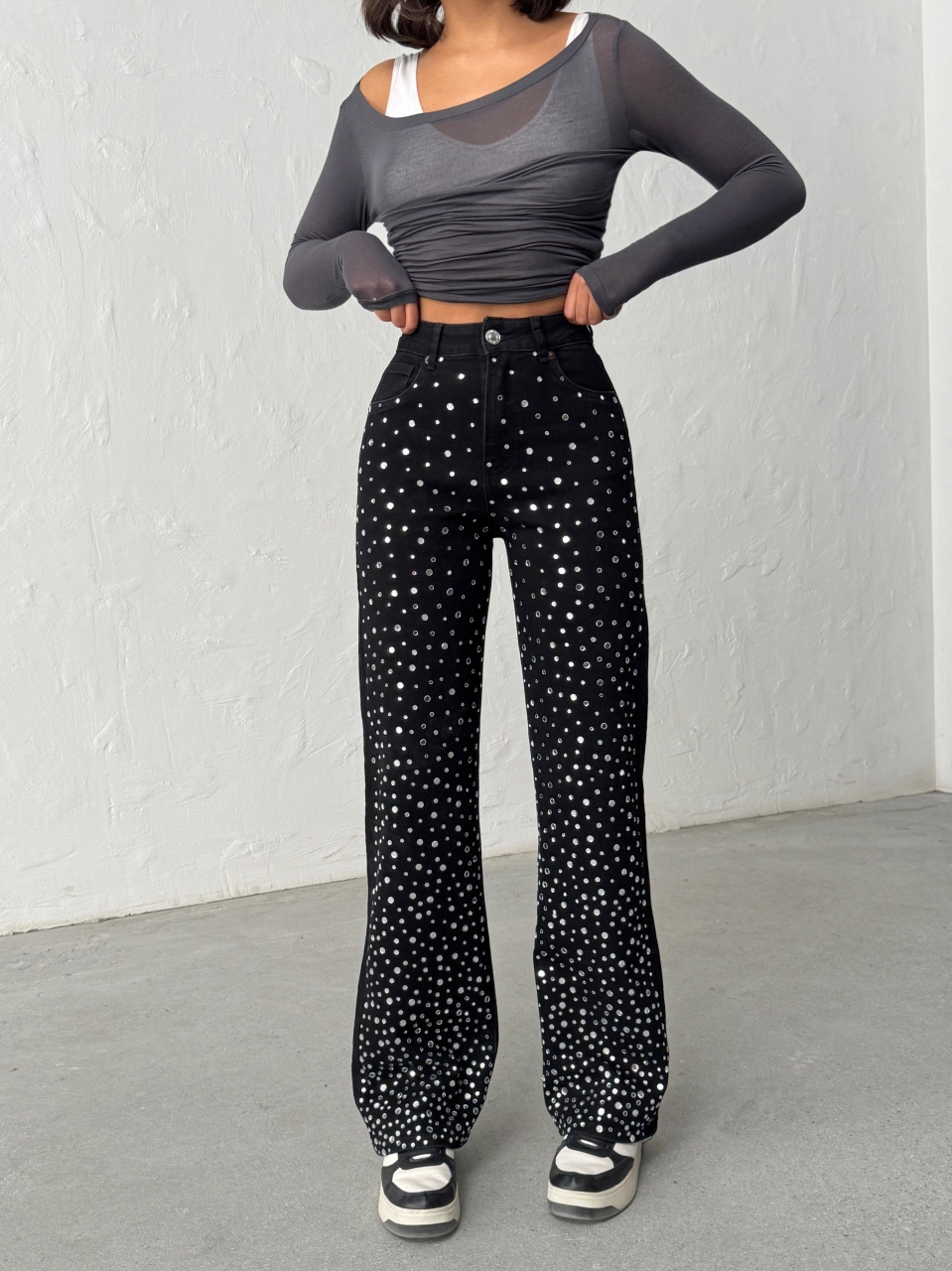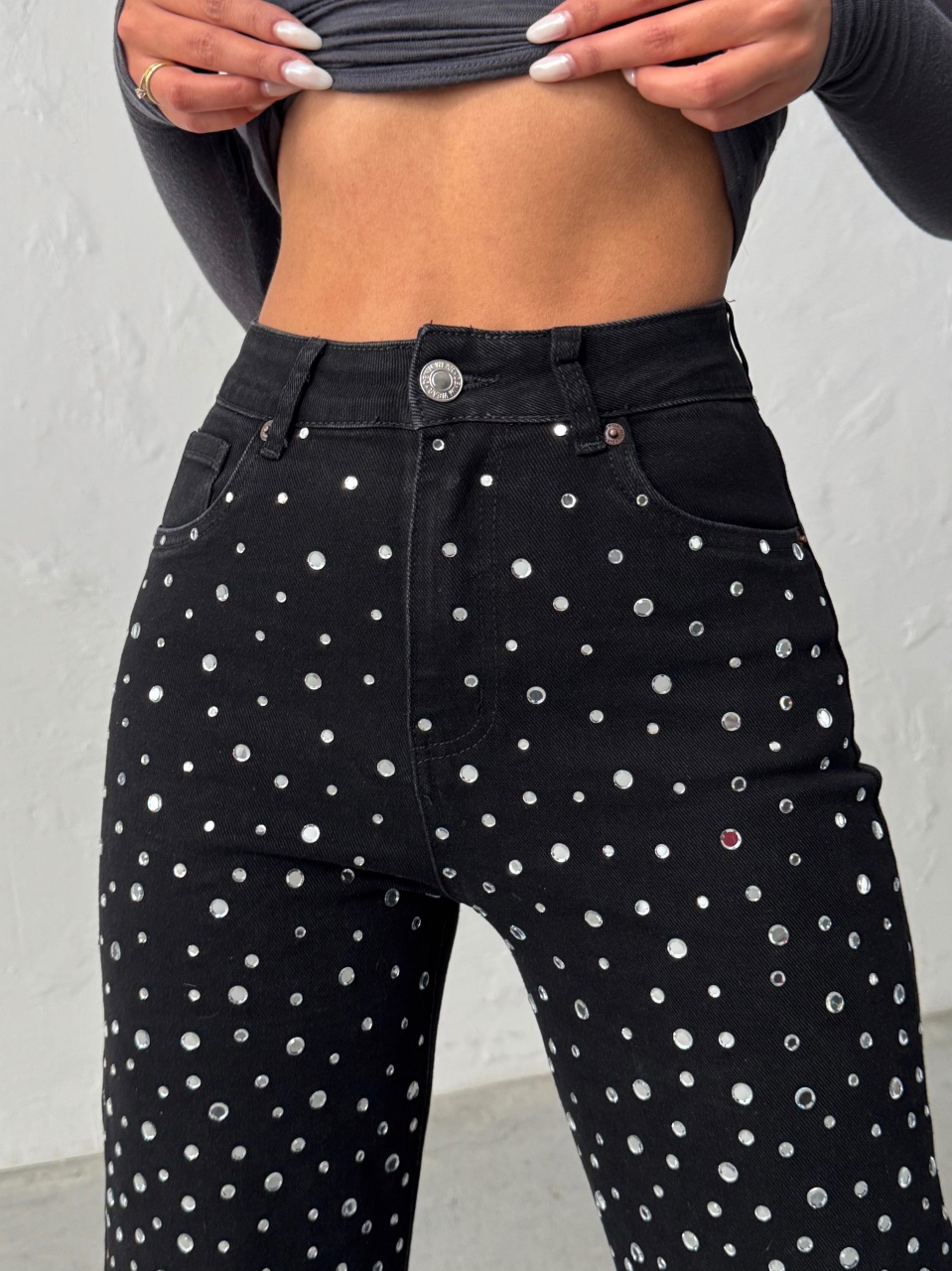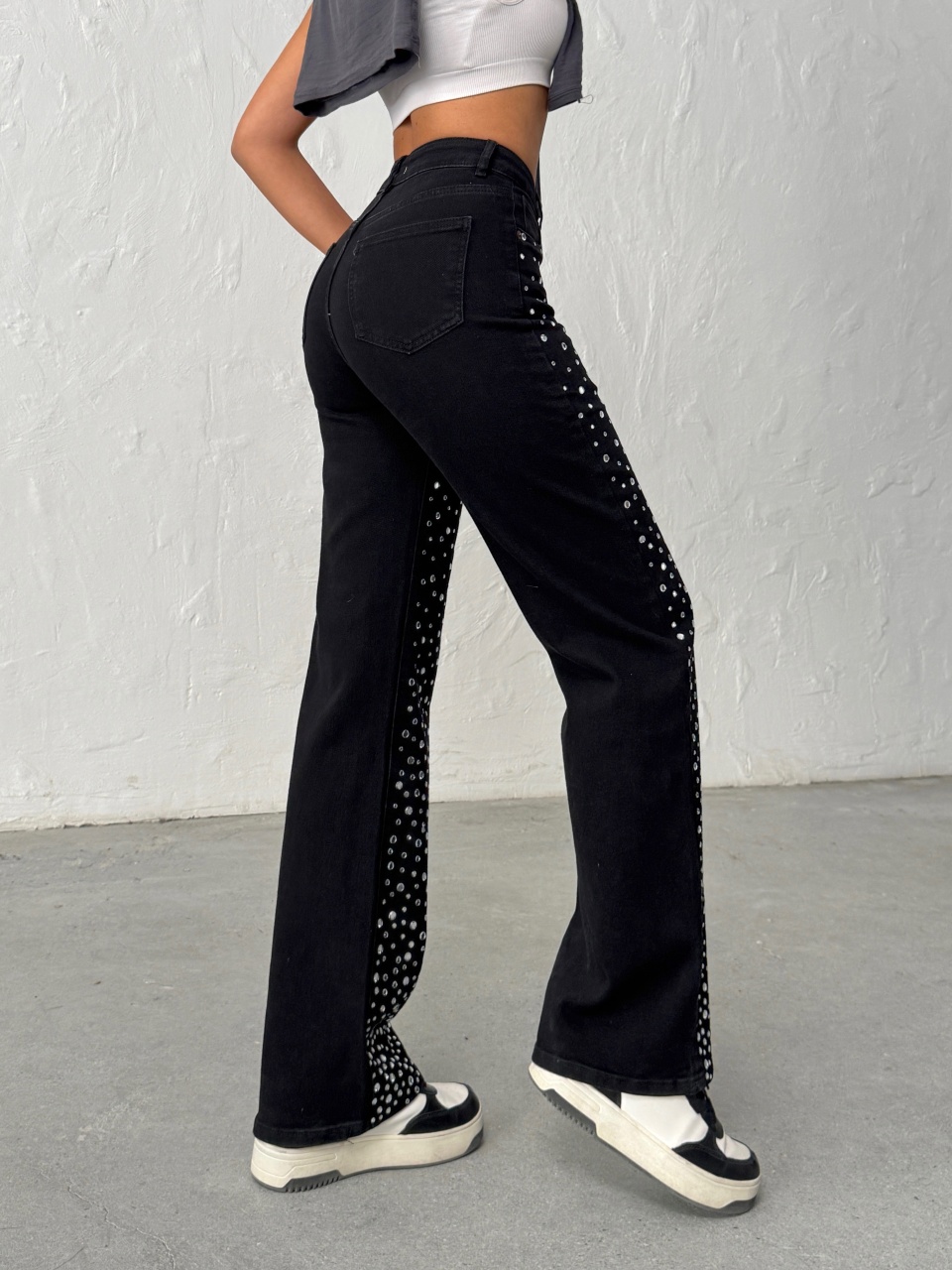 Blugi evazati accesorizati cu pietre decorative