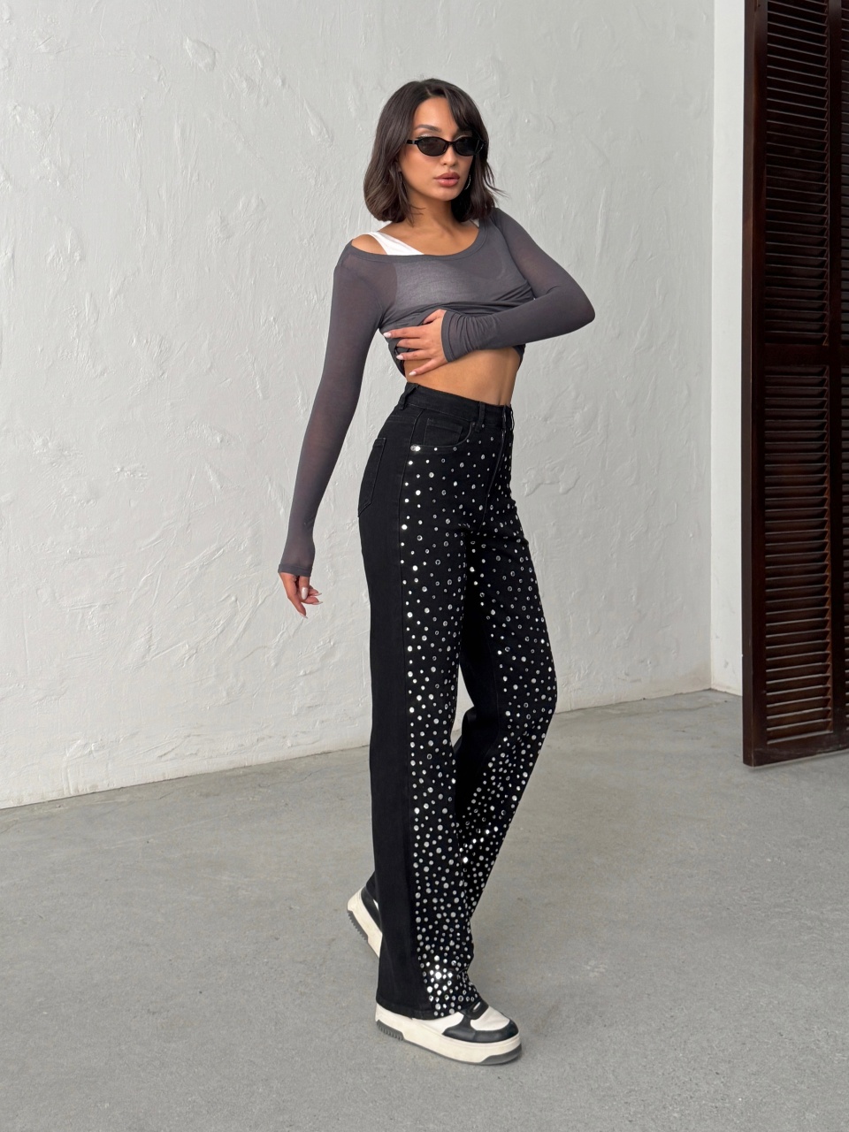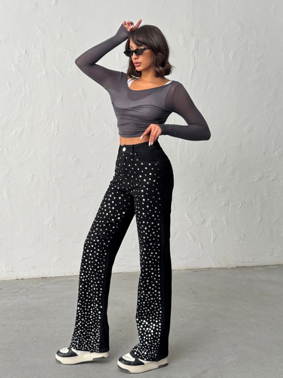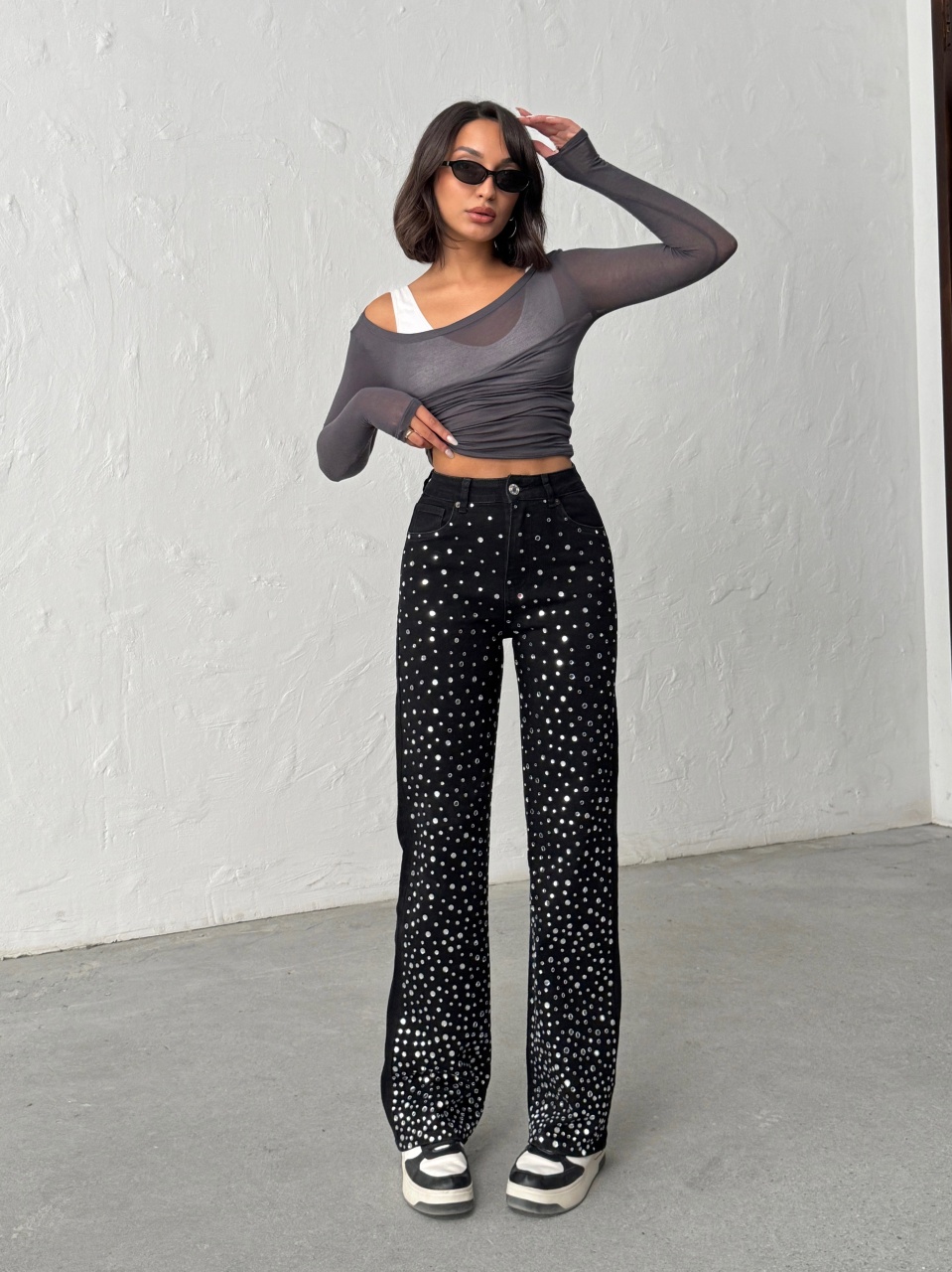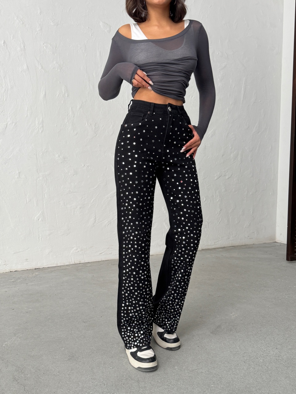 Blugi evazati accesorizati cu pietre decorative