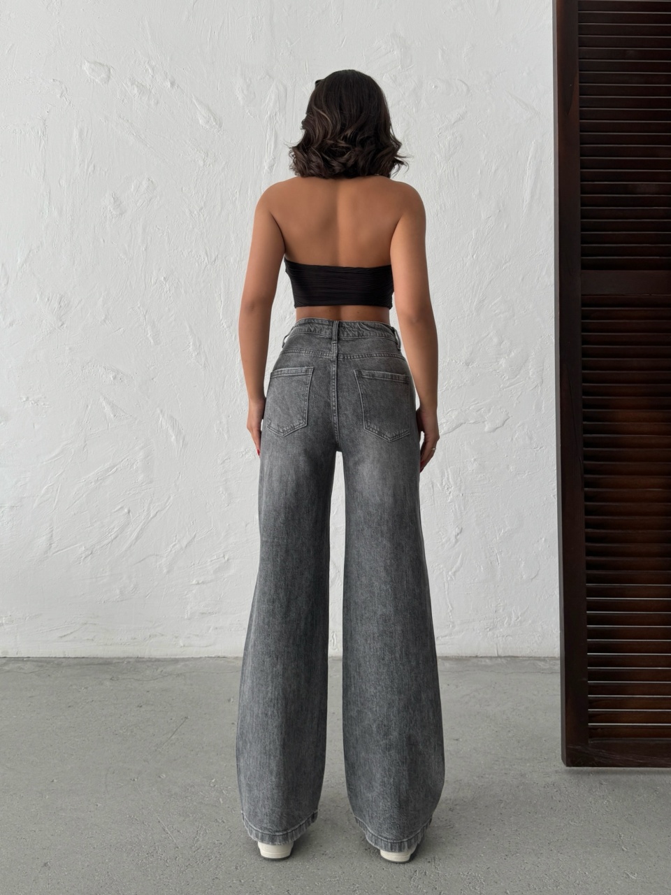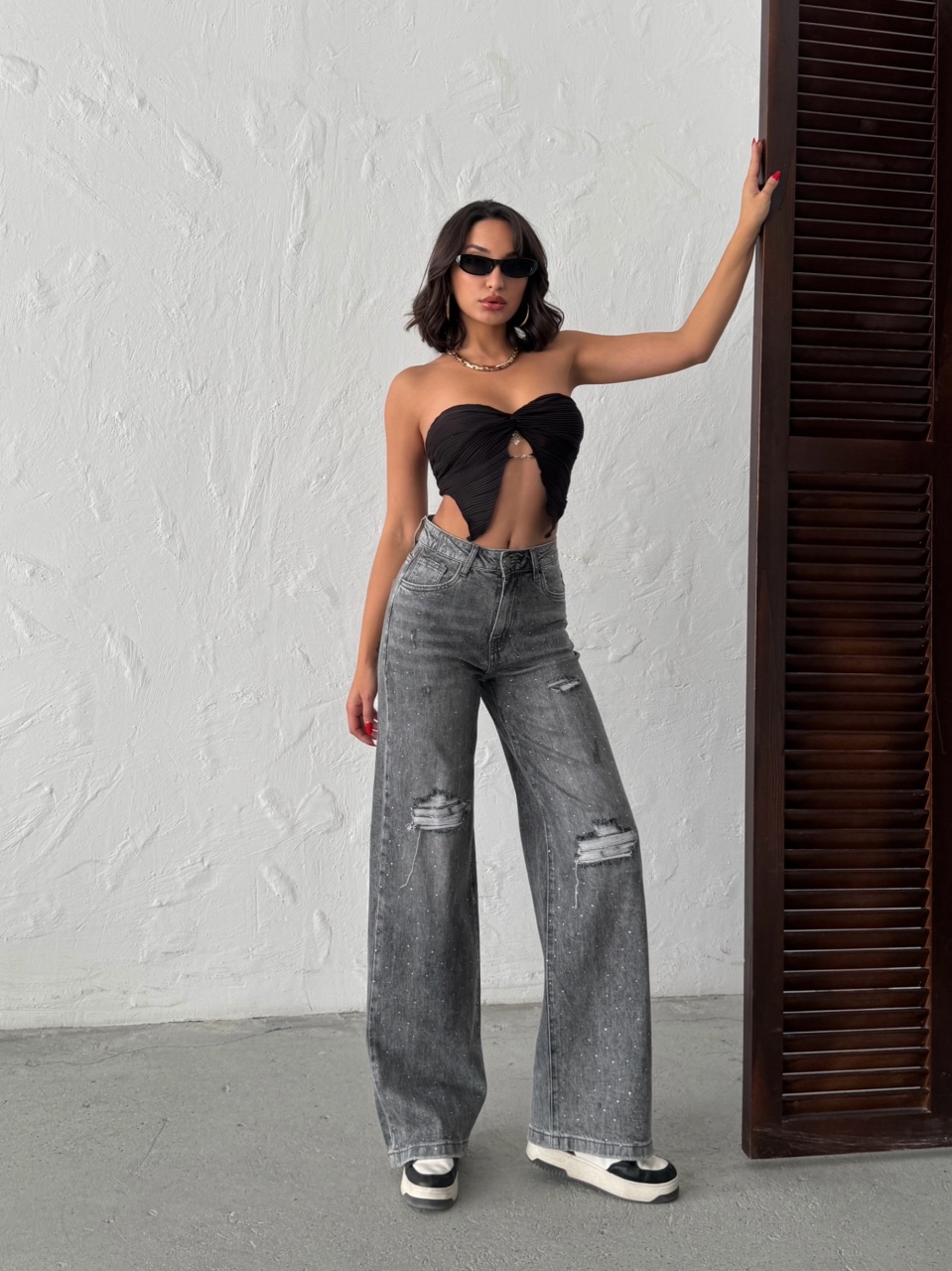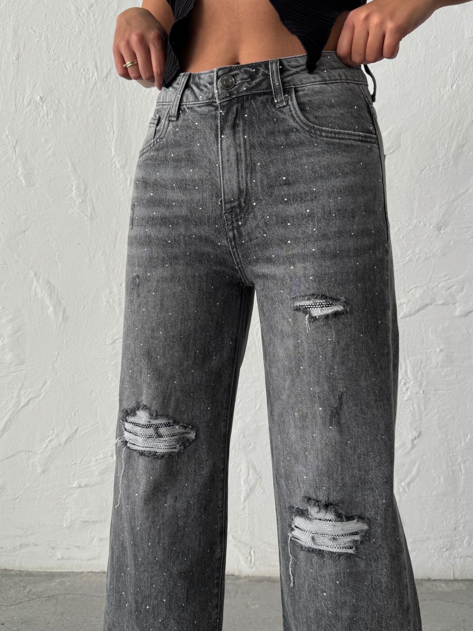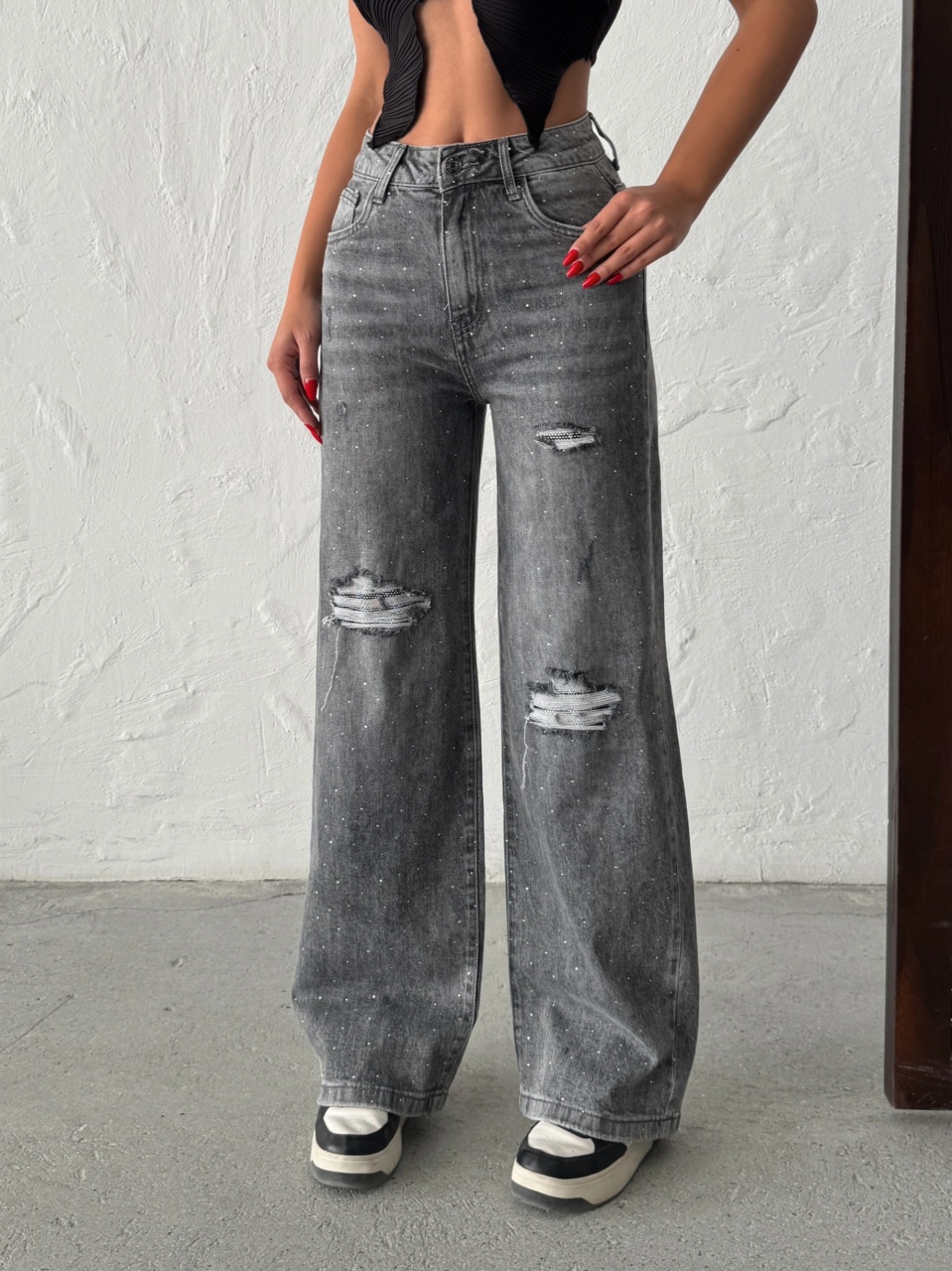 Blugi evazati cu rupturi si aplicatii din strasuri