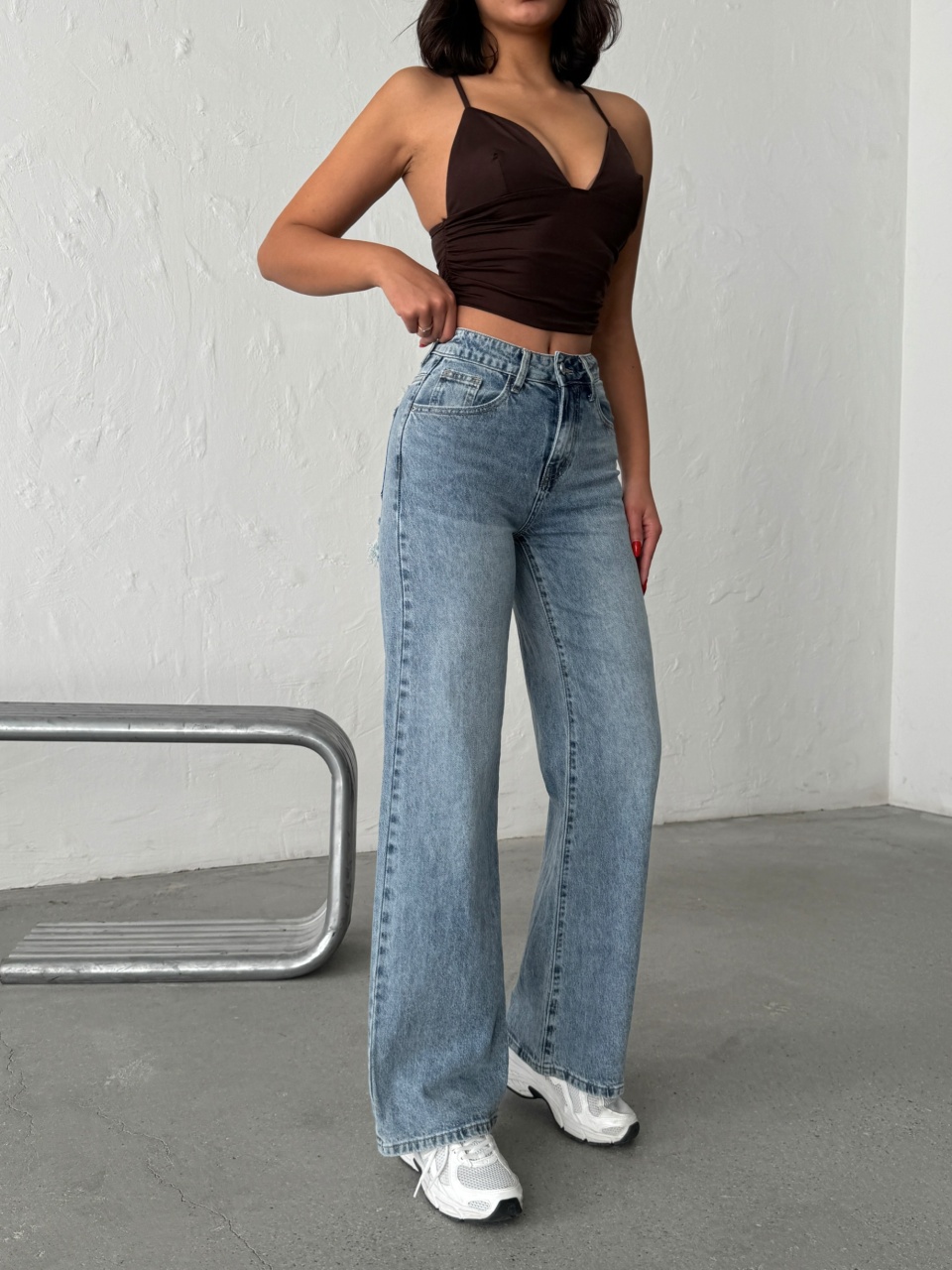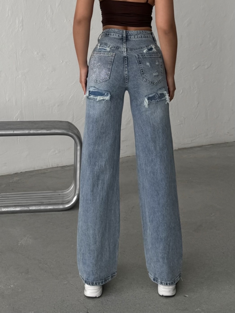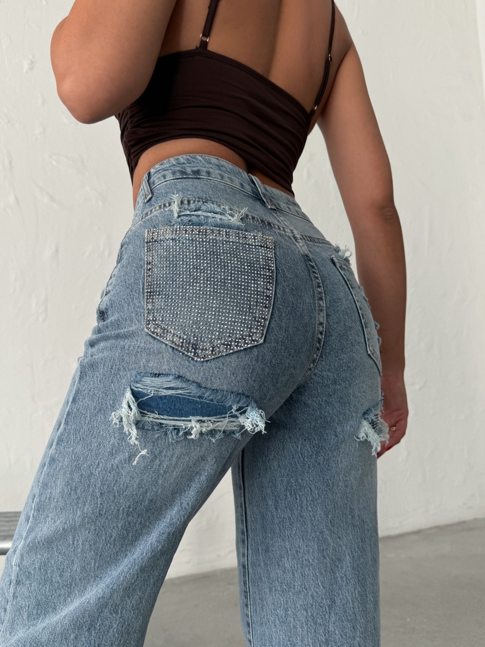 Blugi evazati cu rupturi si aplicatii din strasuri la spate