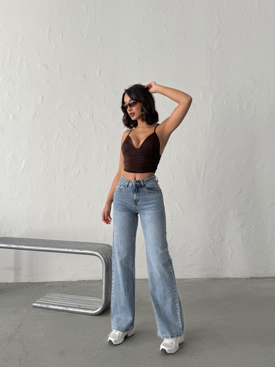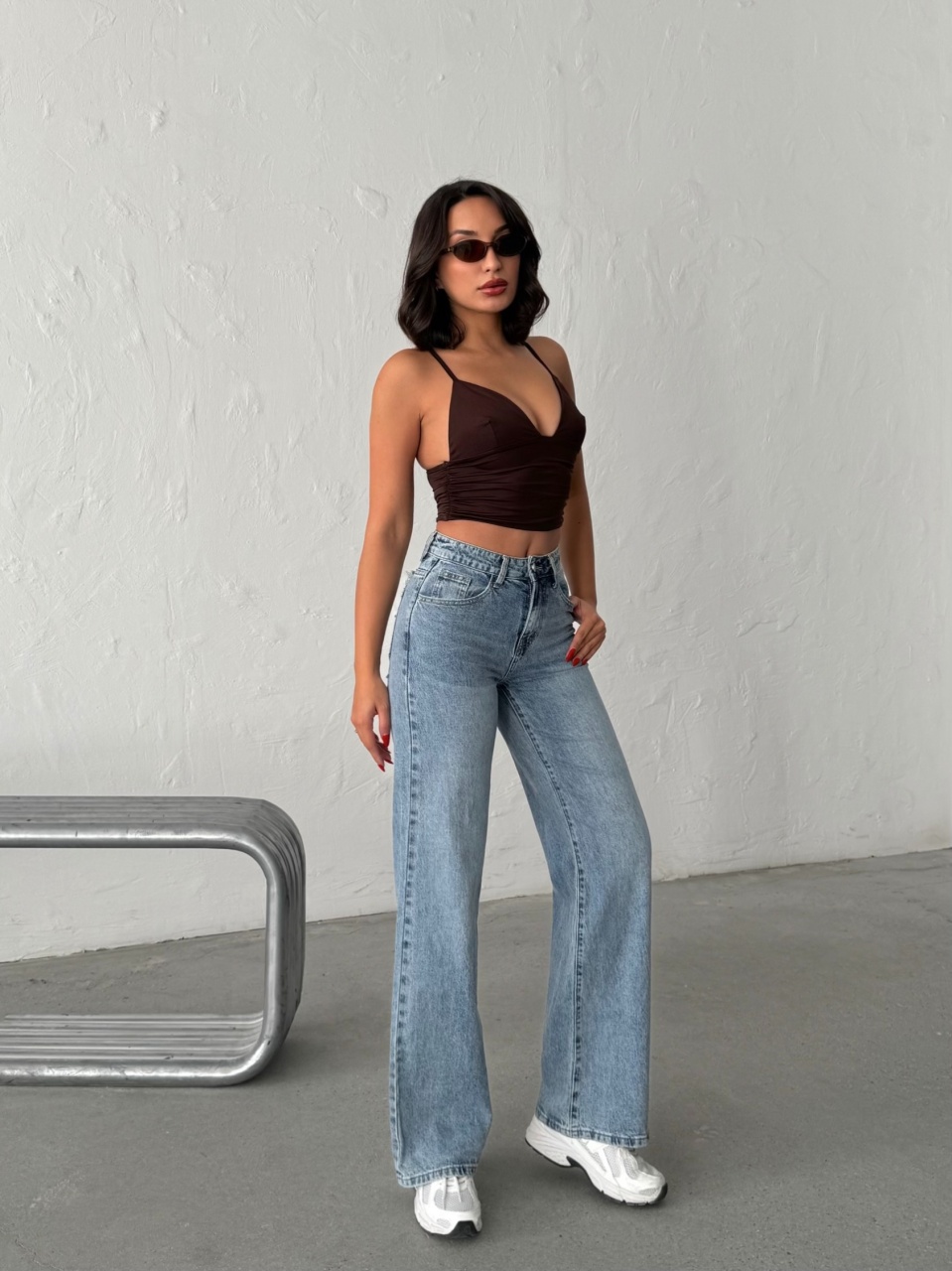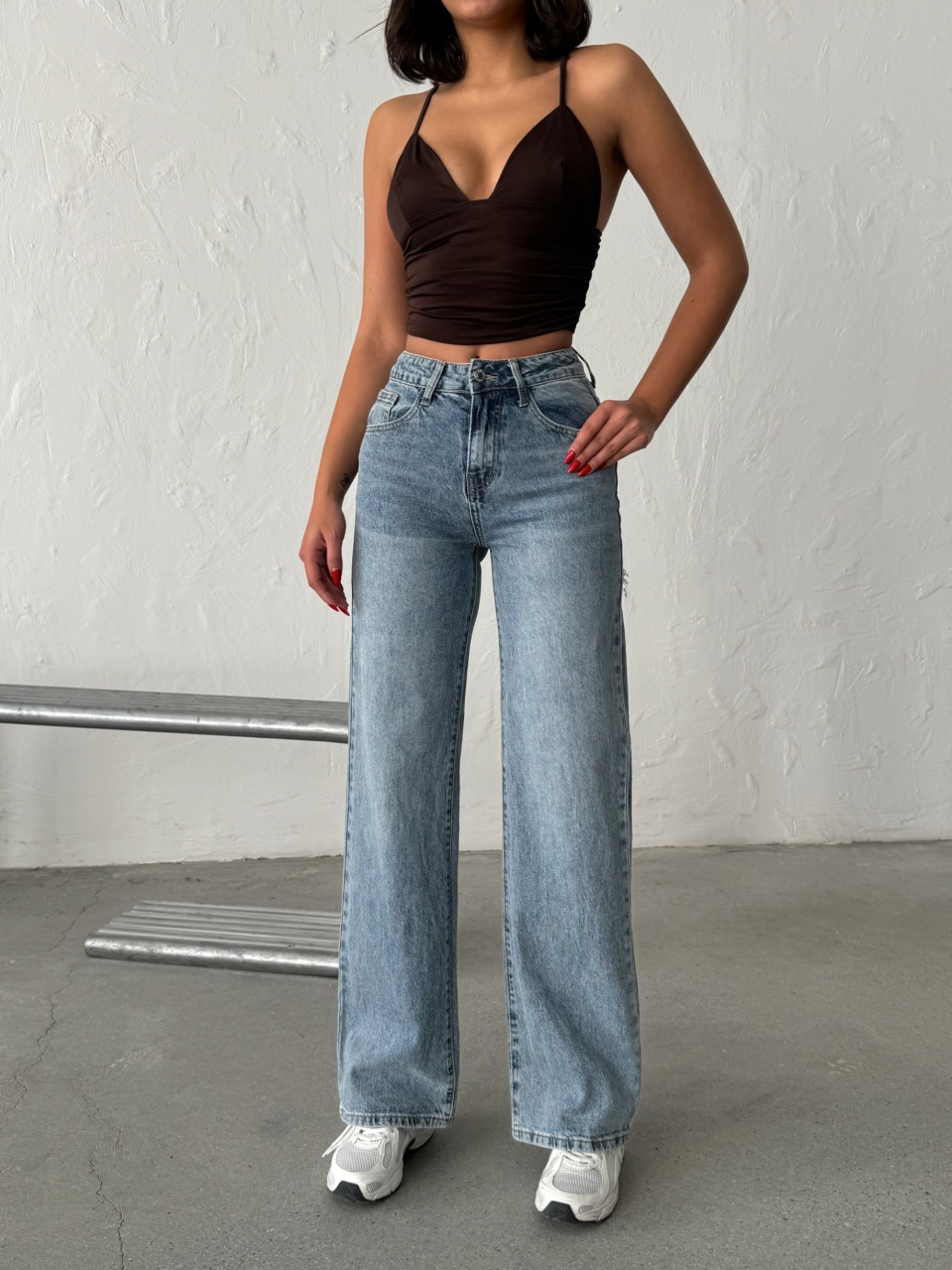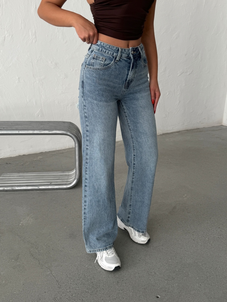 Blugi evazati cu rupturi si aplicatii din strasuri la spate