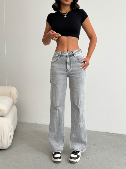 Blugi evazati elastici cu rupturi si design stele
