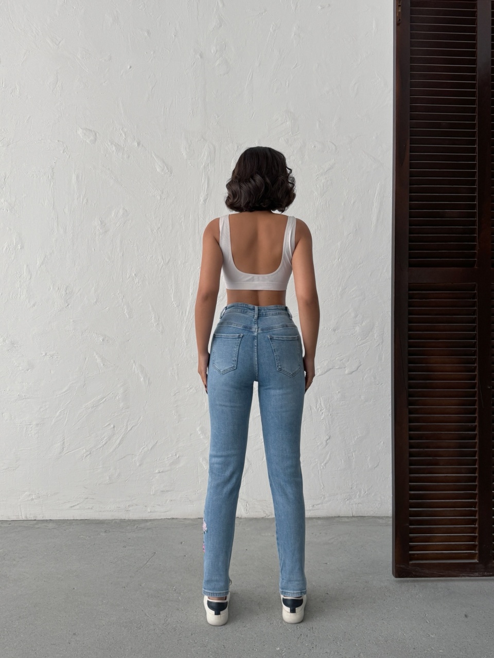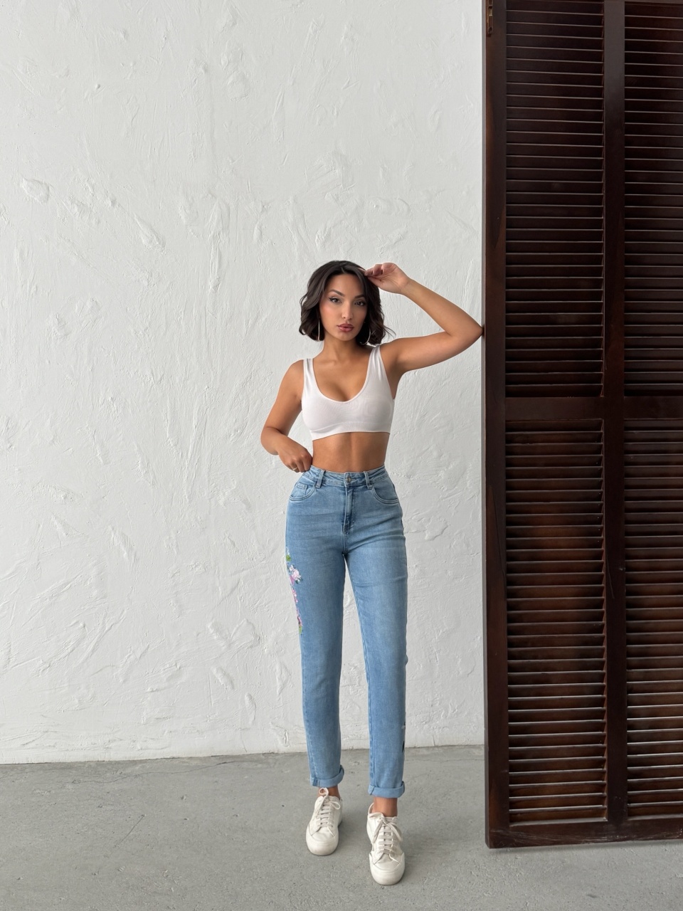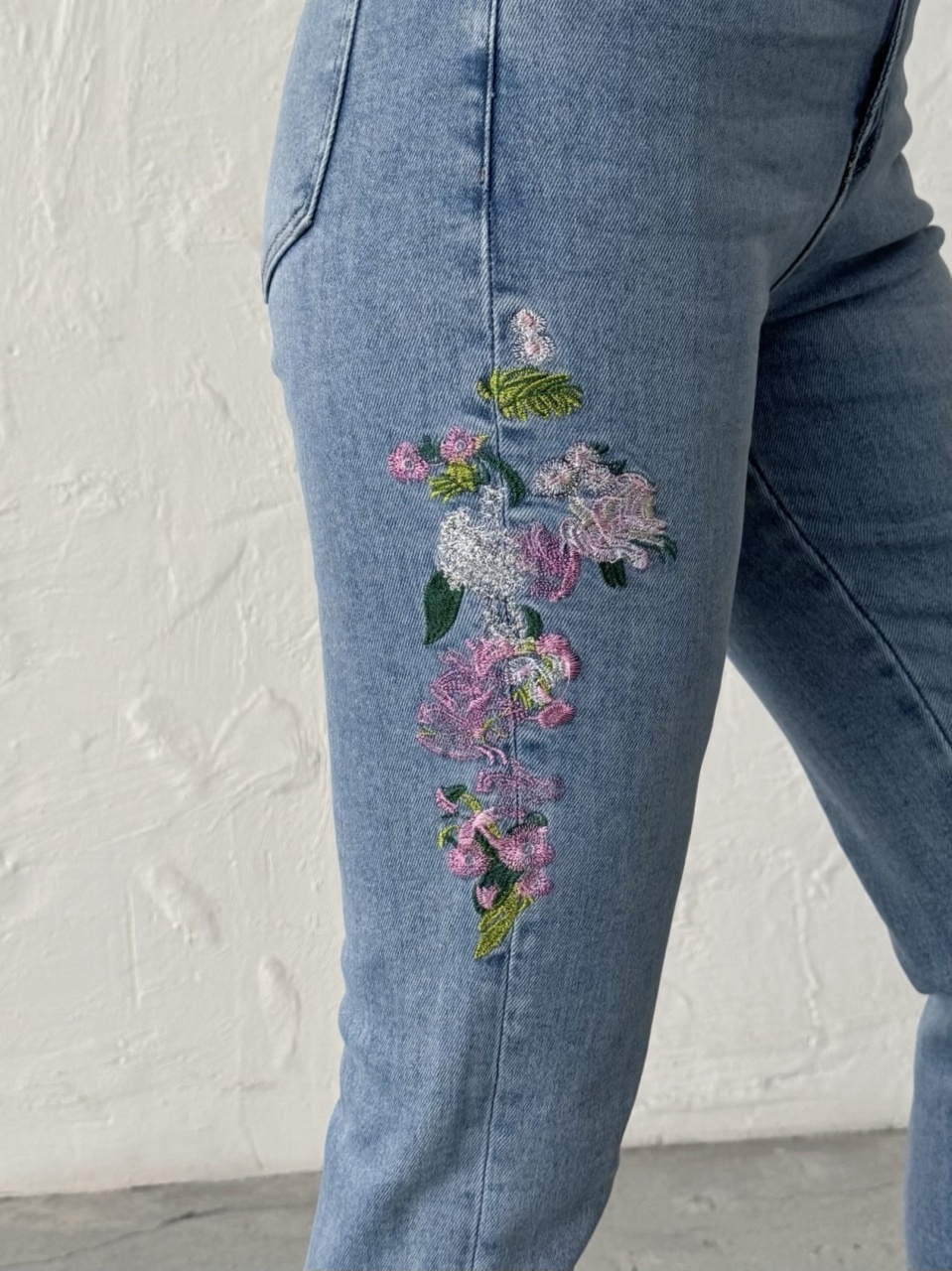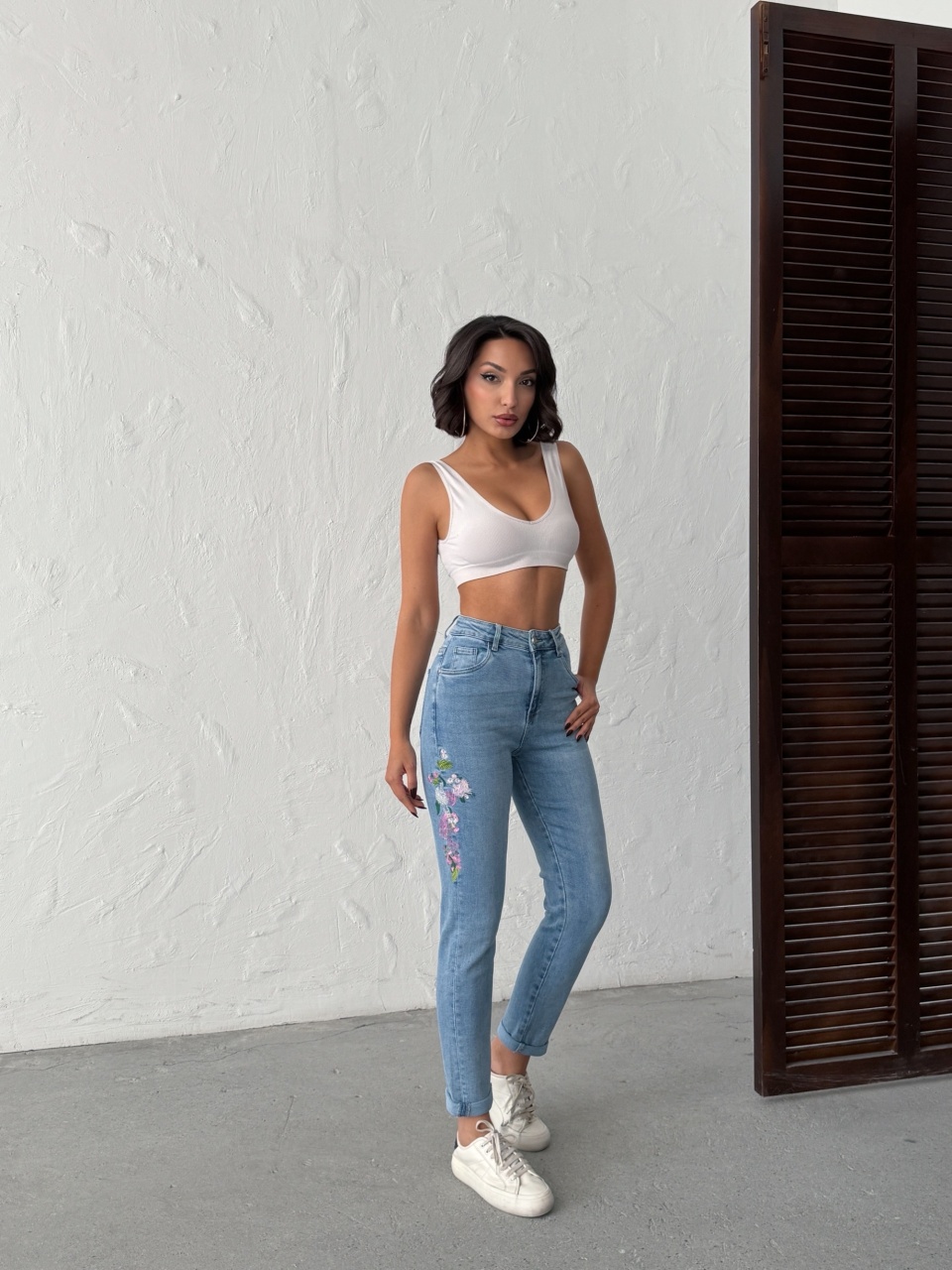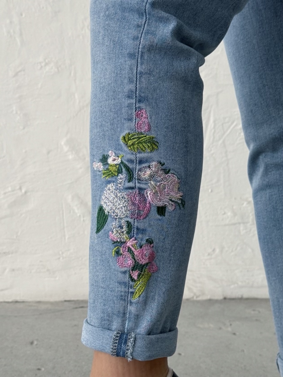 Blugi mom fit cu broderie florală