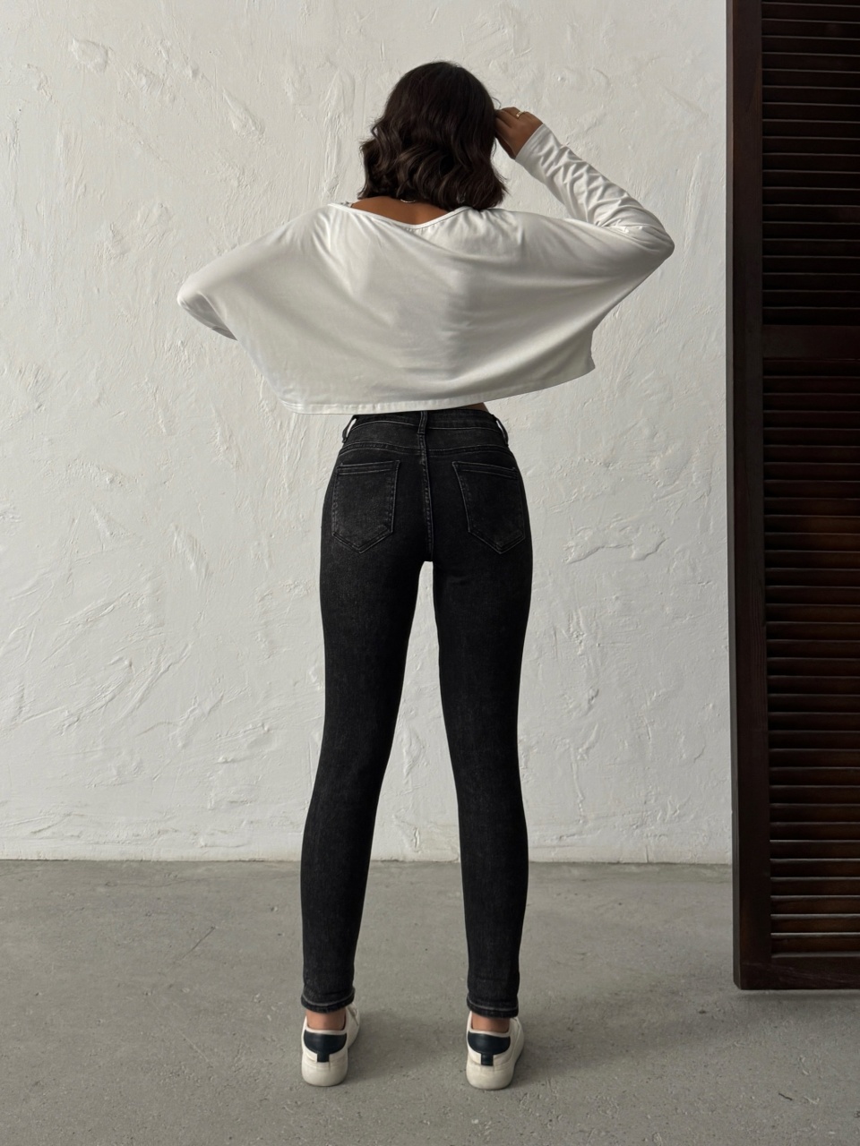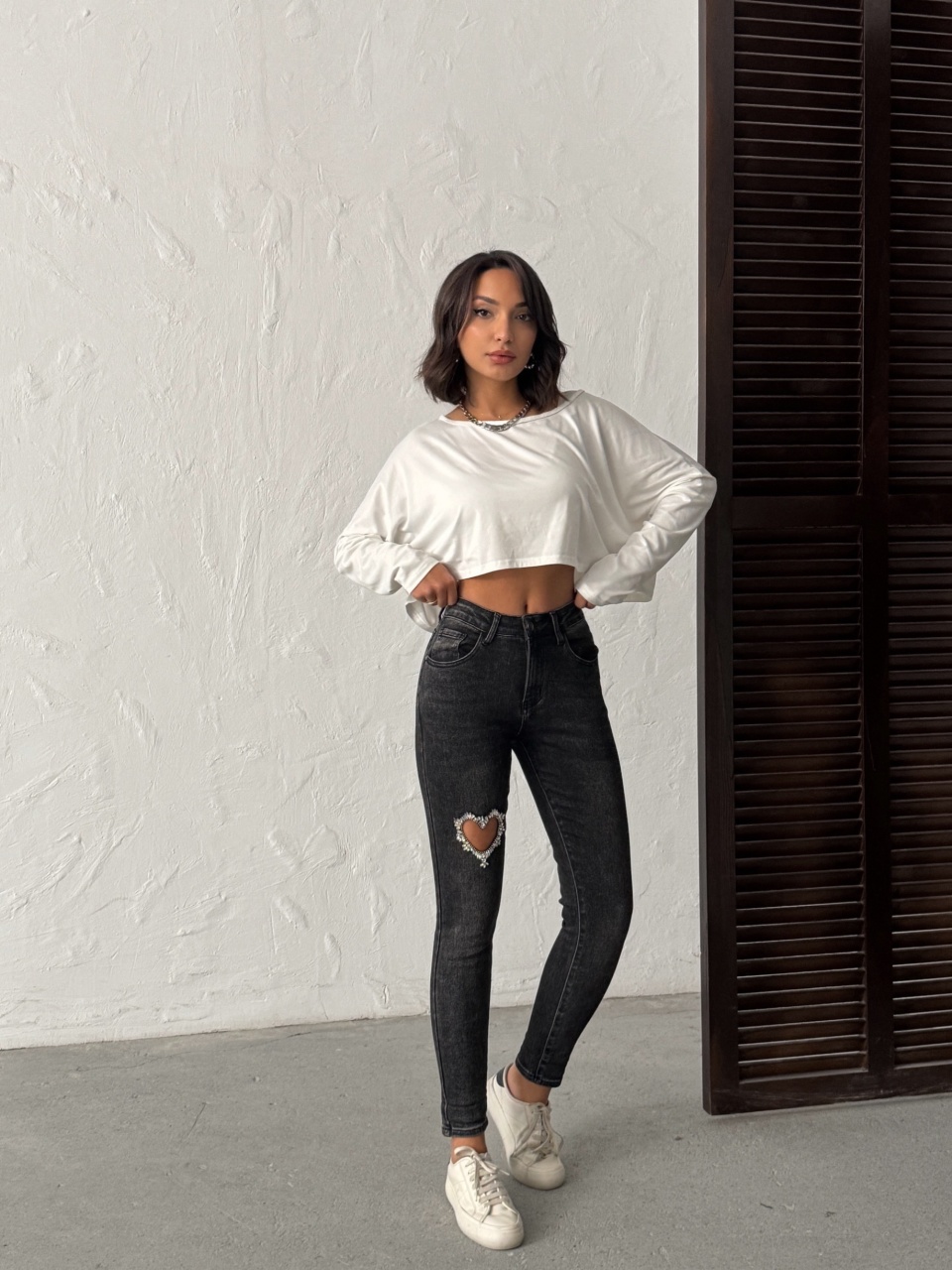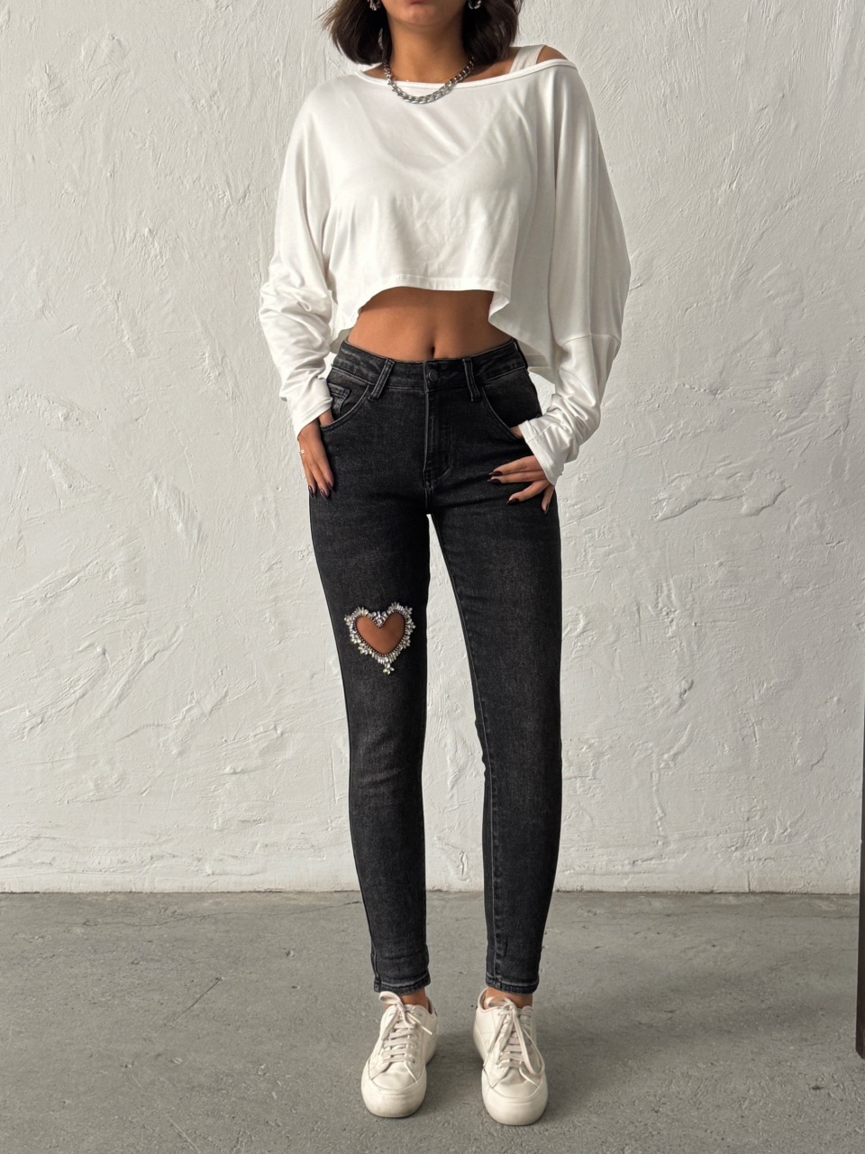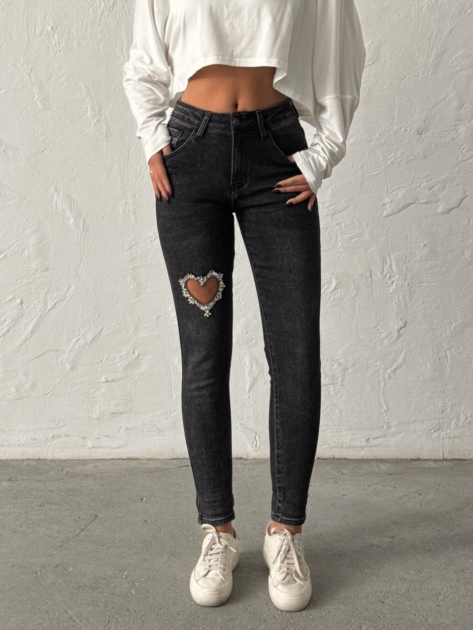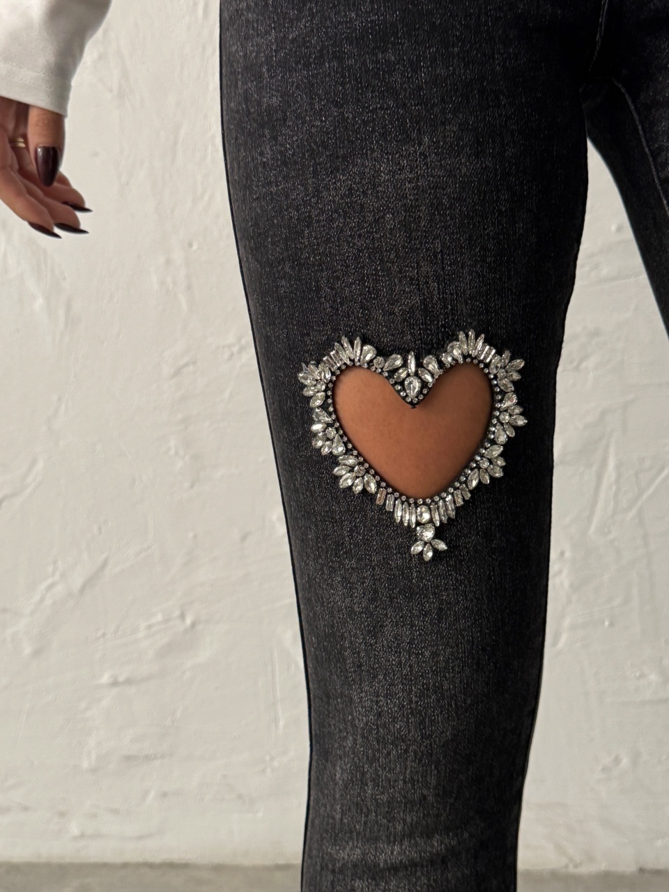 Blugi mom fit cu talie înaltă, realizați din denim confortabil, accesorizați cu un detaliu în formă de inimă decupată și strasuri strălucitoare. Un model modern și feminin, perfect pentru ținute casual cu accente statement.