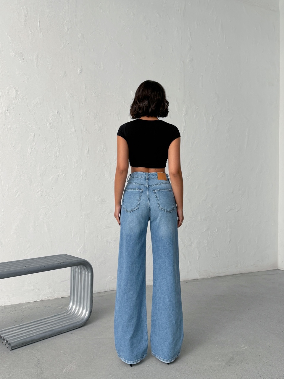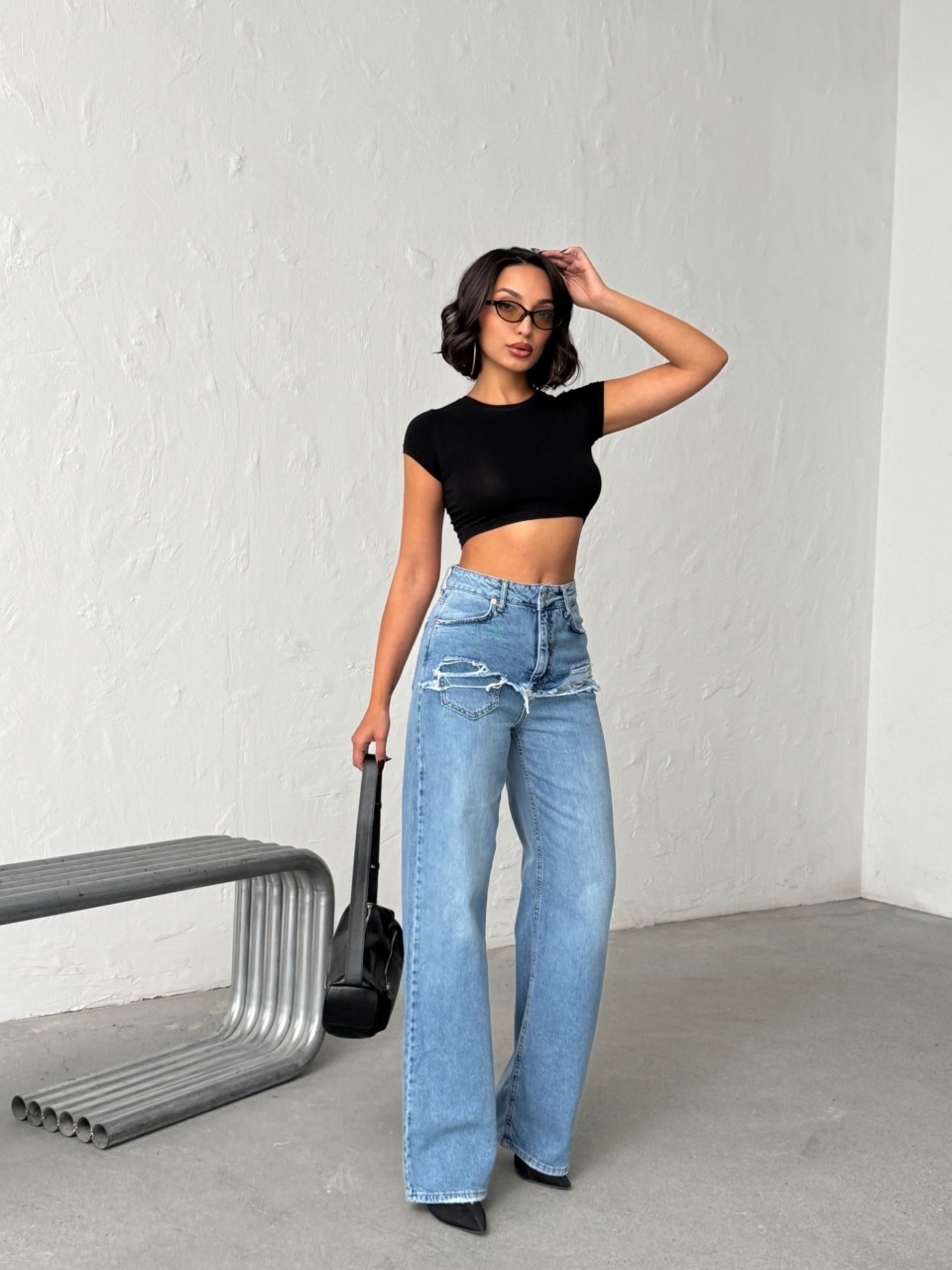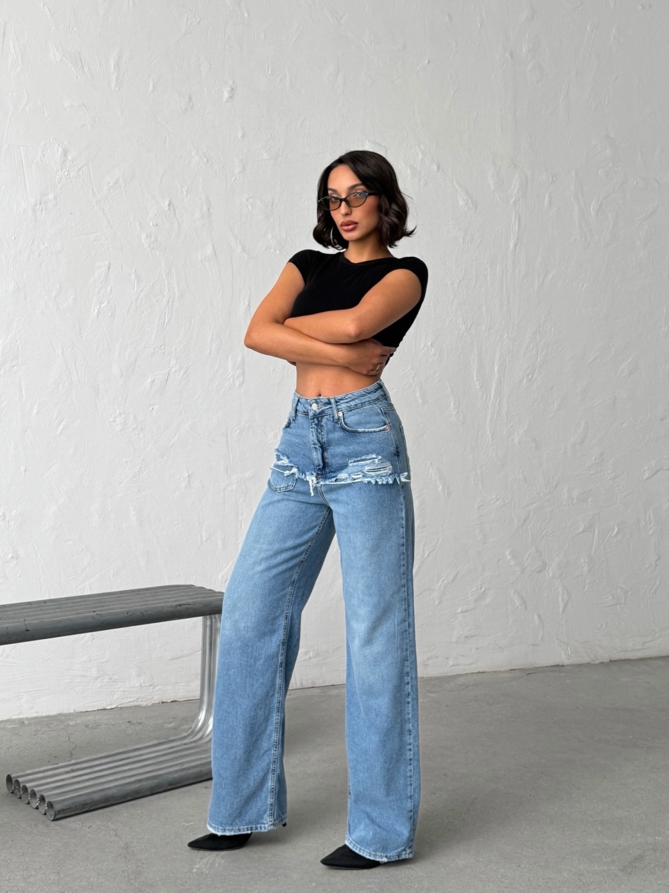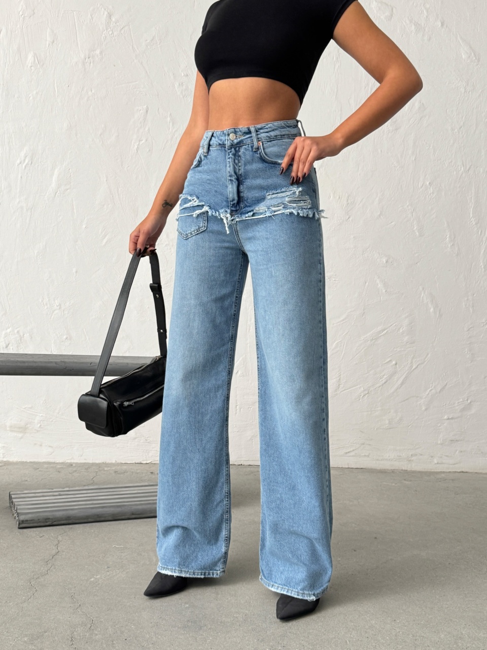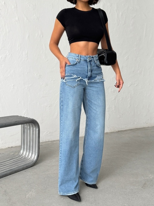 Blugi wide leg cu abraziuni în față, în zona buzunarelor