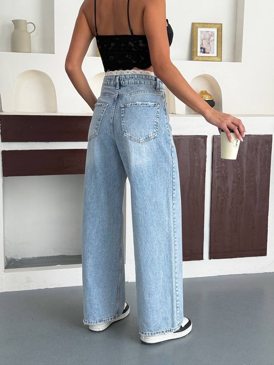 Blugi wide leg cu broderie la talie
