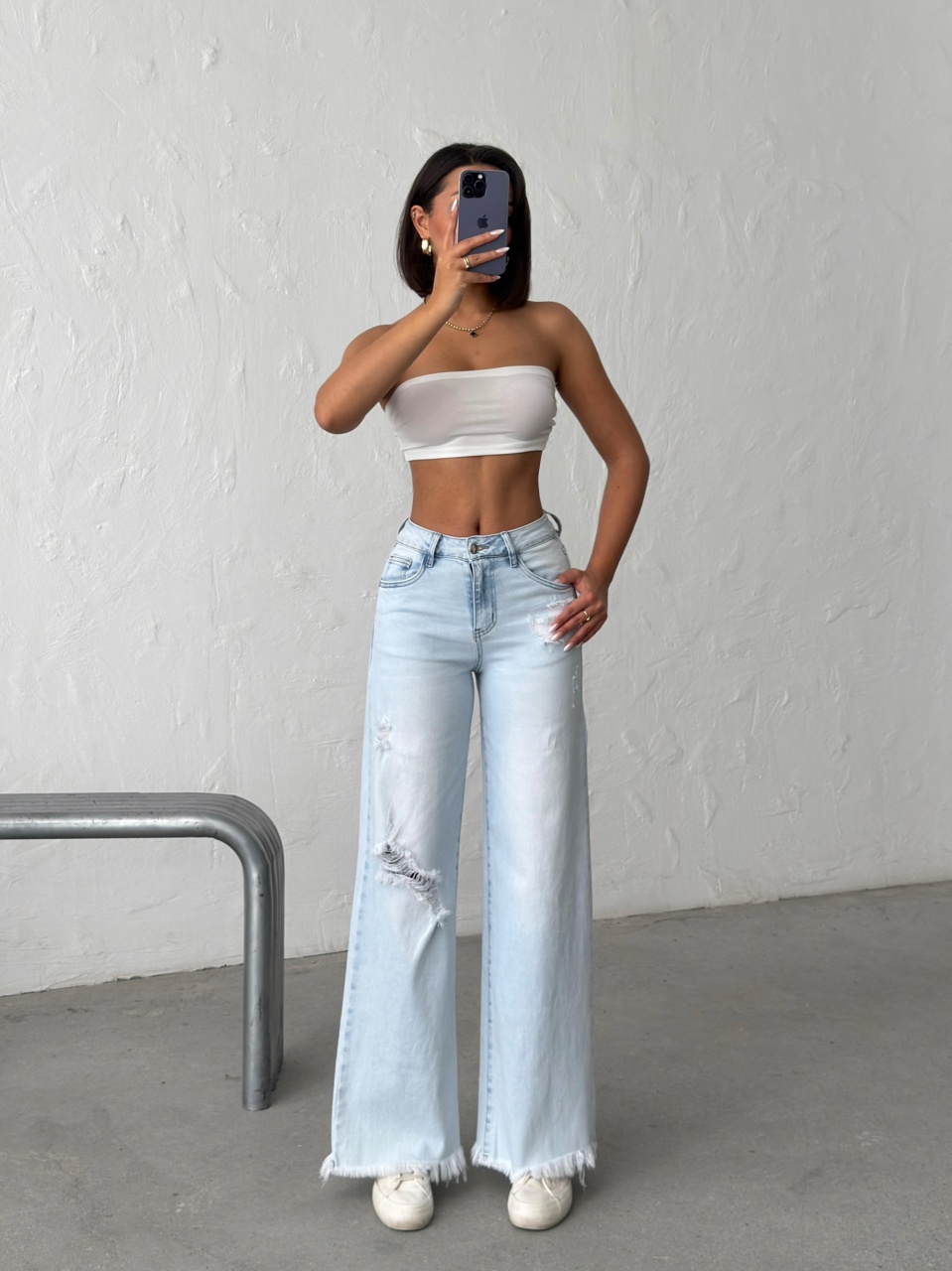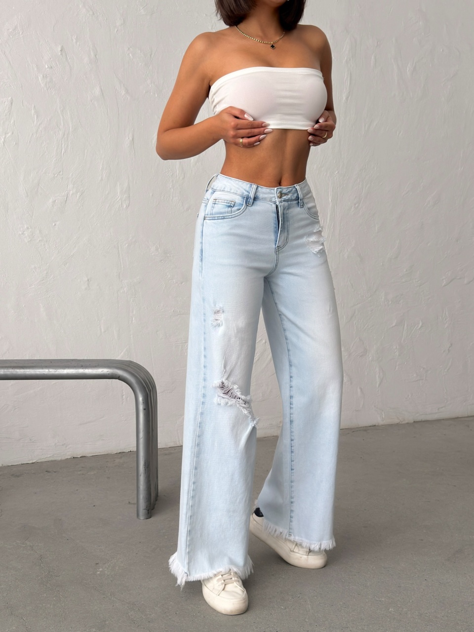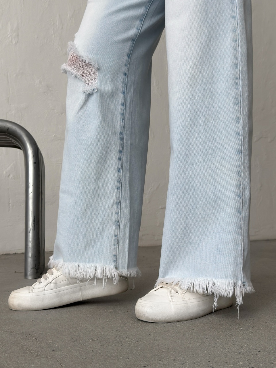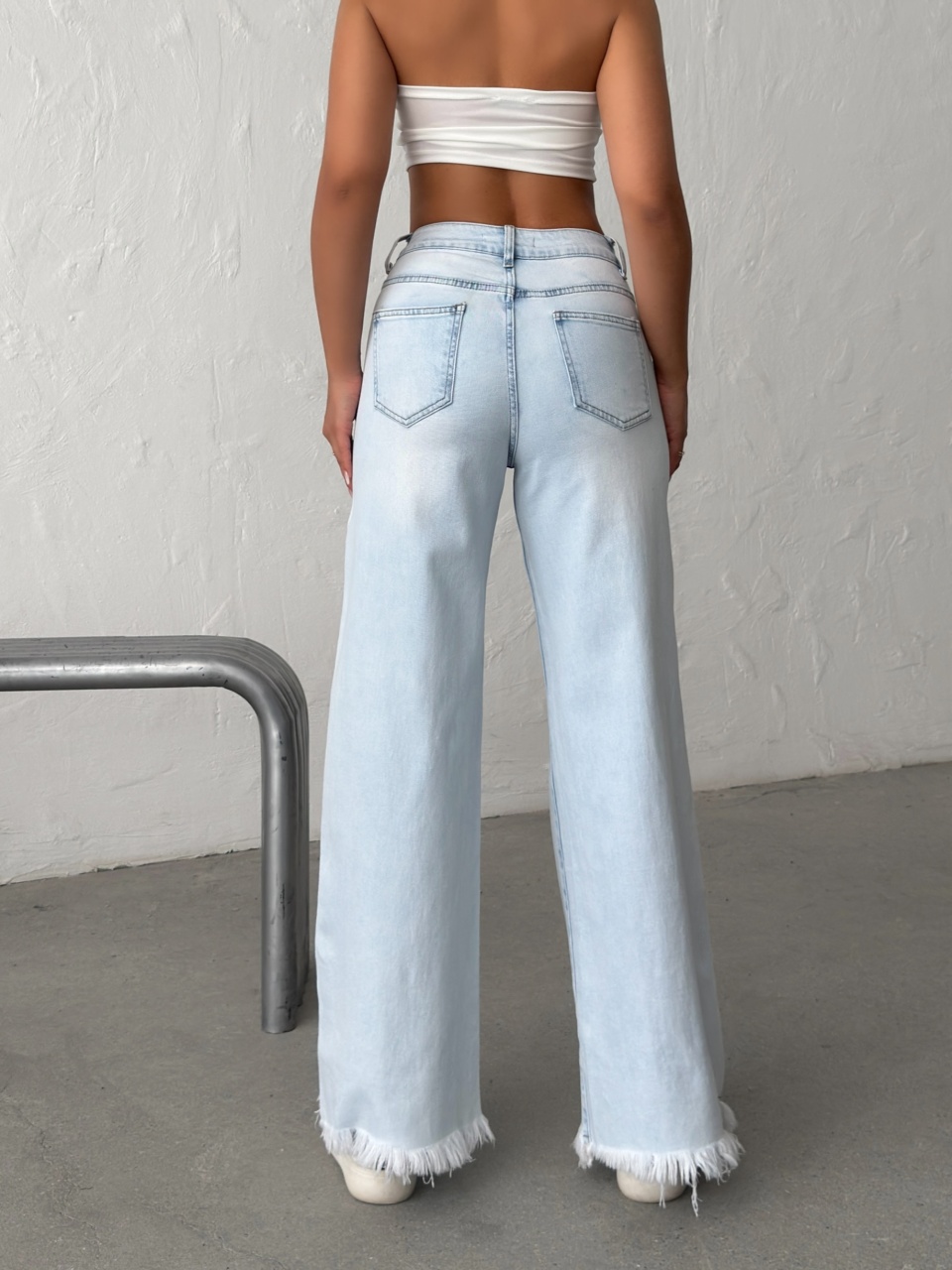 Blugi wide leg cu franjuri la tiv