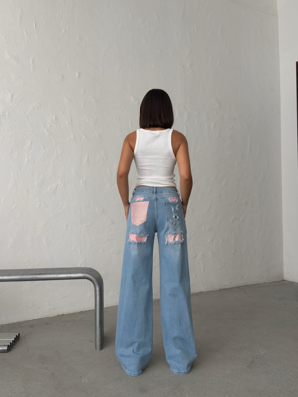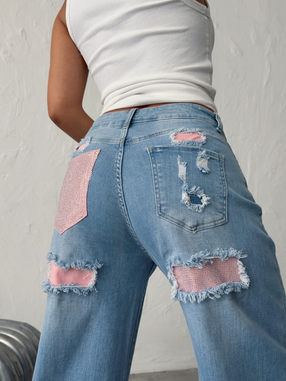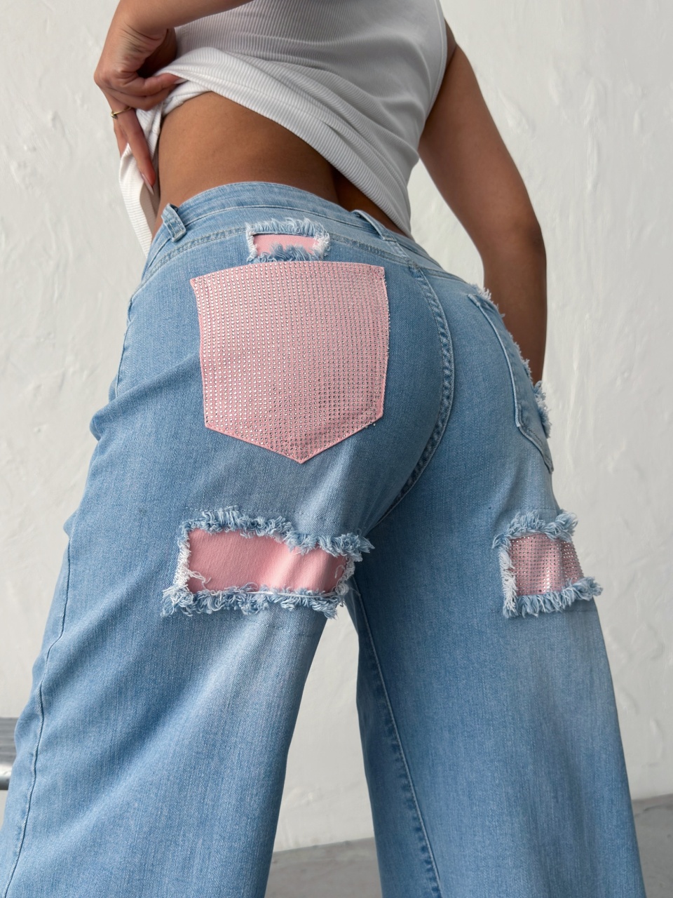 Blugi wide leg cu inserții roz
