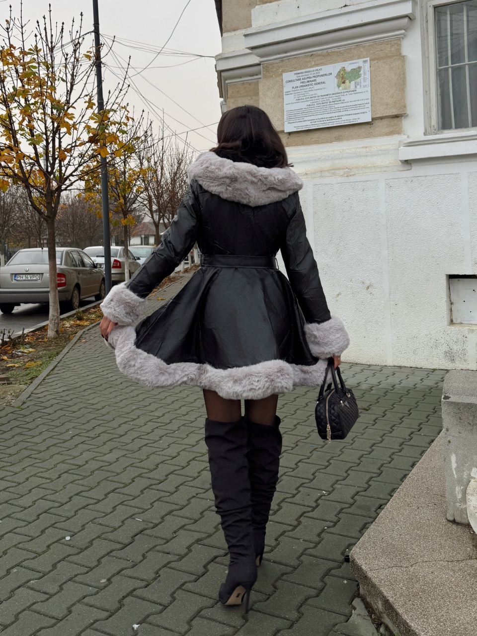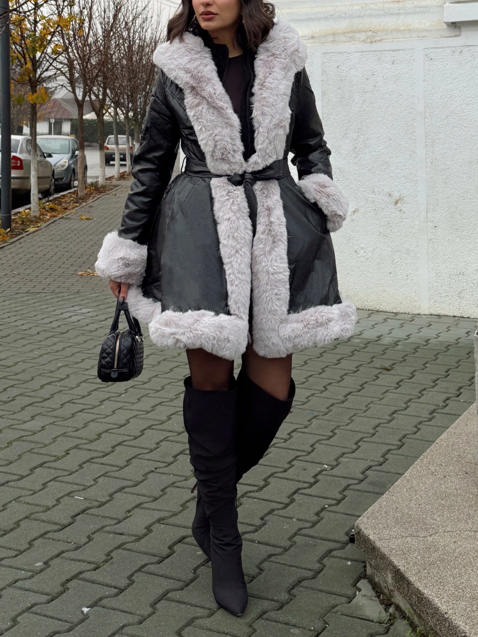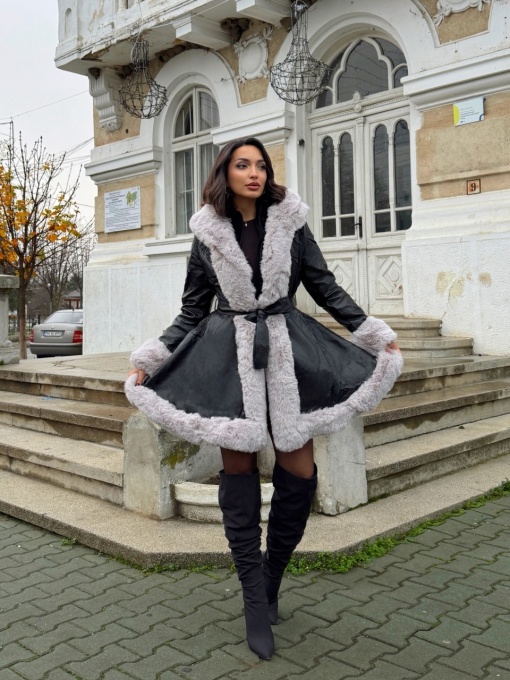 Geaca lunga din imitatie de piele cu blana artificiala
