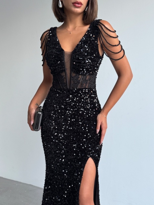 Rochie eleganta lunga cu paiete si lantisoare pe umeri