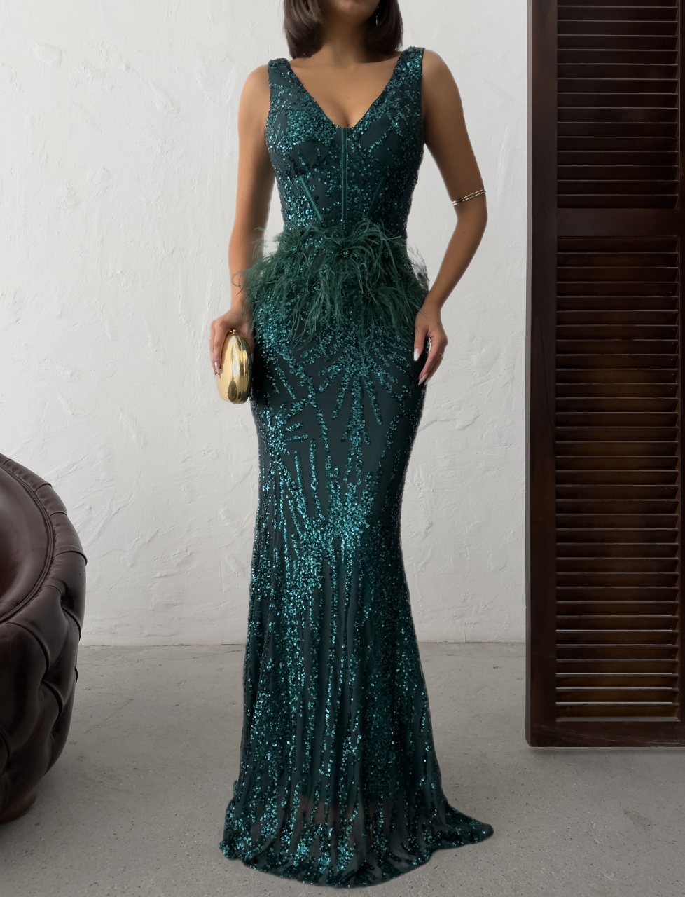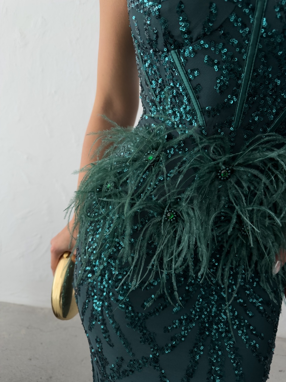 Rochie eleganta lunga cu paiete si pene